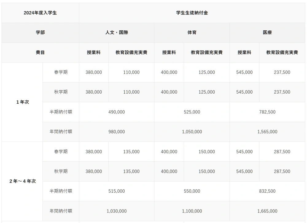| 学院 | 第1年(日元) | 第2至第4年(日元) |